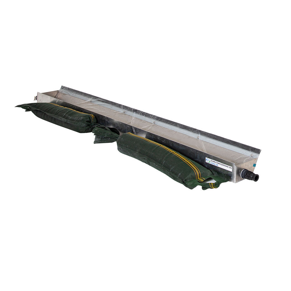 Professionelles Schmutzwasserrinne SR6 Komplett Set Das Schmutzwasserrinne SR6 Komplett Set insgesamt 2 m, inkl. Kamlock Wasseranschlüssen besteht aus: je 1 Stk Schmutzwasserrinne SR2 links, SR2 rechts und SR 2 EM 2 Stk SRV (Systemverbinder) inkl. 1 Stk Streifenbürste á 2 m, werkseitig montiert 5 Stk Ballastsäcke (ungefüllt) Länge 1 m, Durchmesser 0,25 m; inkl. Dichtpaste und Dichtfolie