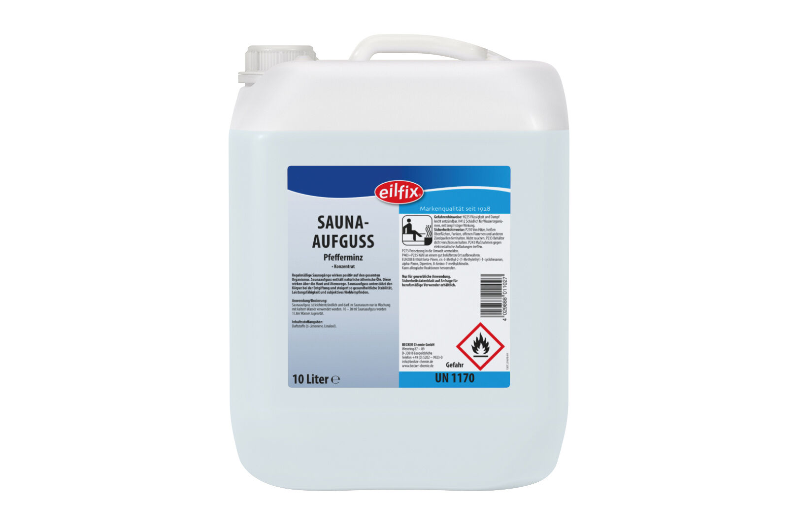 Saunaaufguss Eukalyptus – Konzentrat Regelmäßige Saunagänge wirken positiv auf den gesamten Organismus. Saunaaufguss enthält natürliche ätherische Öle. Diese wirken über die Haut und Atemwege. Saunaaufguss unterstützt den Körper bei der Entgiftung und steigert so gesundheitliche Stabilität, Leistungsfähigkeit und subjektives Wohlempfinden. Vorteile  klassische und moderne Duftnoten wirtschaftliche Großgebinde Der Saunaaufguss Eukalyptus ist in folgenden Ausführungen erhältlich: 1 Liter Flasche 10 Liter Kanister ProdukteigenschaftenGebindegrößen:1 L Flasche, 10 L KanisterAggregatzustand:flüssigGeruch:parfumiertFarbe:klarpH-Wert:n.a.VE Flasche:12 StkVE Kanister:1 StkVE Palette Flasche:480 StkVE Palette Kanister:60 Stk Pflichthinweise H225 Flüssigkeit und Dampf leicht entzündbar | H317 Kann allergische Hautreaktionen verursachen | H411 Giftig für Wasserorganismen, mit langfristiger Wirkung P210 Von Hitze, heißen Oberflächen, Funken, offenen Flammen sowie anderen Zündquellen fernhalten. Nicht rauchen | P233 Behälter dicht verschlossen halten | P241 Explosionsgeschützte elektrische/Lüftungs-/Beleuchtungsgeräte verwenden | P243 Maßnahmen gegen elektrostatische Entladungen treffen | P273 Freisetzung in die Umwelt vermeiden | P280 Schutzhandschuhe tragen | P403+P235 An einem gut belüfteten Ort aufbewahren. Kühl halten.
