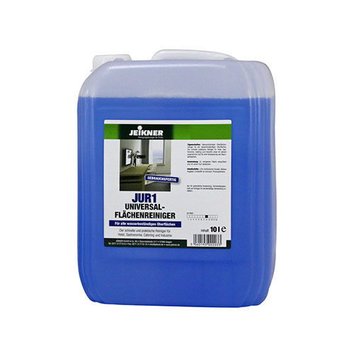 Gebrauchsfertiger Oberflächenreiniger für alle wasserbeständigen Oberflächen Schneller und praktischer Reiniger in der Sprühflasche für Hotel, Gastronomie, Catering und Industrie sorgt für schnelle und gründliche Sauberkeit. Mit seinem angenehmen Duft verbessert er sofort die Raumatmosphäre. Vorteile Sprühflasche mit Schaumsprüher schneller Einsatz keine Überdosierungsgefahr zeitsparend optimal für kleine Objekte super Duft! Den JUR1 Universalreiniger, gebrauchsfertig erhalten Sie in folgenden Ausführungen: 500 ml Sprühflasche 10 Liter Kanister Anwendung / Dosierung Zu reinigende Fläche einsprühen und mit einem Tuch abwischen. Lagerhinweise: Frostfrei lagern. Bei sachgemäßer Lagerung mindestens 2 Jahre verwendbar. Ökologie: Die in der Mischung verwendeten Tenside entsprechen der Detergenzienverordnung (Nr. 648/2004) und sind vollständig aerob abbaubar. Zusammensetzung: Inhaltsstoffangabe: < 5% nichtionische Tenside. Weitere Angaben: Duftstoffe (d-Limonen), Phenoxyethanol. Produkteigenschaften Gebindegrößen: 500 ml Sprühflasche / 10 Liter Kanister Geruch: produktspezifisch Farbe: blau pH-Wert (bei 20 °C): 7,96  Aggregatzustand: flüssig VE Sprühflasche: 12 Stk. VE Kanister: 2 Stk. Pflichthinweise Das Gemisch ist nicht als gefährlich eingestuft im Sinne der Verordnung (EG) Nr. 1272/2008.