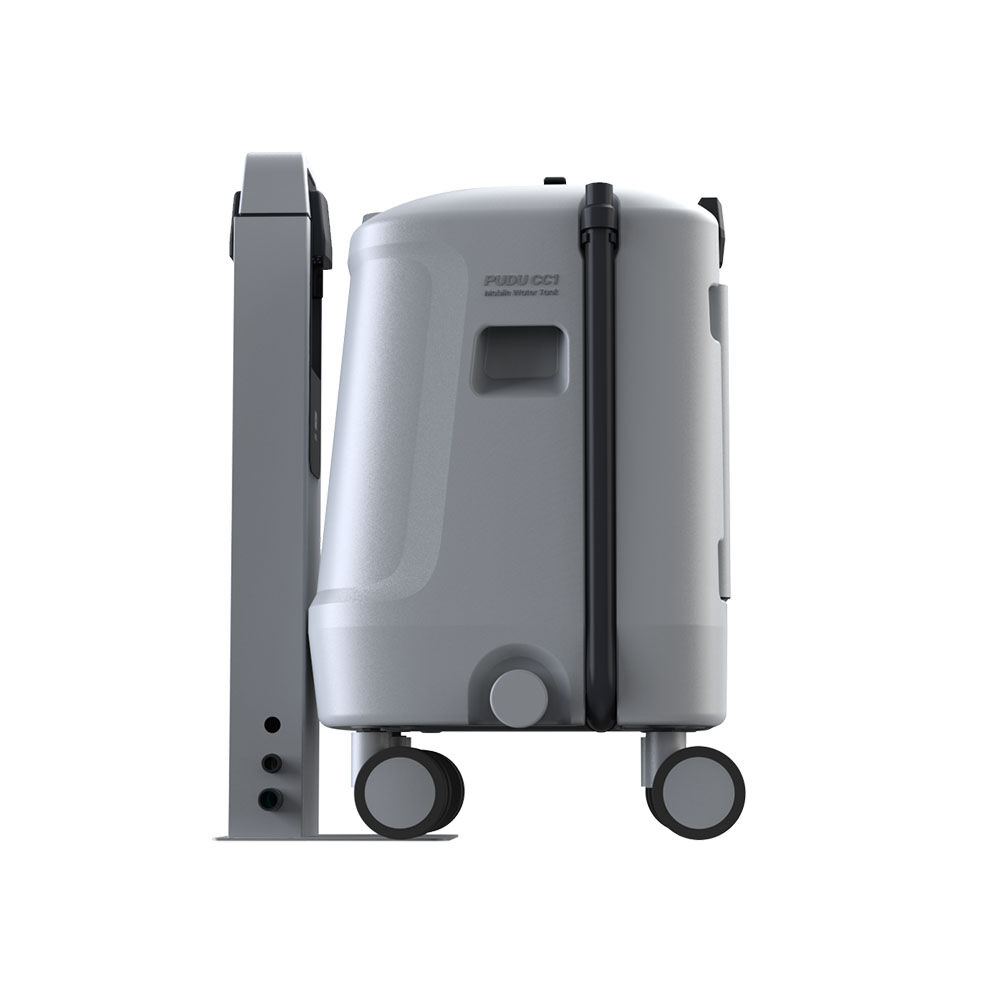 Der Pudu CC1 Reinigungsroboter ist in der Lage, völlig autonom zu arbeiten. Er lädt seinen Akku und den Wassertank selbstständig an der Dockingstation auf. Diese muss allerdings mit einem Wasseranschluss verbunden werden. Da das nicht immer möglich ist, bietet Pudu die mobile Wasserstation für den CC1.