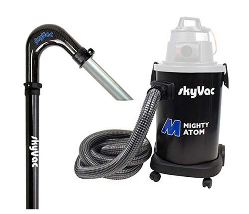 skyVac Mighty Atom Dachrinnensauger mit Steckstangen-Set Der skyVac Mighty Atom ist ein leistungsstarker Allround-Nass- und Trockensauger. Mit einem Fassungsvermögen von 35 Litern ist er ideal für den privaten und gewerblichen Einsatz. Der skyVac Mighty Atom wurde entwickelt, um beste Reinigungsergebnisse bei Arbeiten in bis zu 10,5 m Höhe zu erzielen. Er bietet eine Leistung von 1600 Watt, ist robust, zuverlässig und einfach zu bedienen. Im Vergleich zum skyVac Atom, verfügt der Mighty Atom über den größeren 50 mm Cyclonic-Sauganschluss. Die Cyclonic-Technologie sorgt mit einem verstärkten Luftstrom für schnellere Ergebnisse und weniger Verstopfungen, da der Schmutz in der Trommel besser verteilt wird. Der skyVac Mighty Atom ist außerdem mit einer praktischen Ausblas-Öffnung ausgestattet – ideal zum Laubblasen. Kompaktes Design und Räder machen den Mighty Atom leicht manövrierbar - perfekt Einsätze mit wenig Bewegungsfreiheit. Mit einem Gewicht von 8 kg ist der skyVac Mighty Atom leicht zu transportieren und passt bequem in ein größeres Mittelklasse-Fahrzeug. Er ist wartungsfreundlich, verfügt über einen auswaschbaren Filter und ist netzbetrieben. Zum Entleeren wird einfach der Deckel abgenommen und der Inhalt ausgeschüttet. Der Mighty Atom ist mit zwei unterschiedlichen Stangen-Sets erhältlich. Dieses Set beinhaltet Saugstangen mit 44 mm Durchmesser und Steckmechanismus. Mit nur 310 Gramm pro Stangenelement, sind die Saugstangen leicht, steif und ideal für die Dachrinnenreinigung. Die Stangen sind nicht kompatibel mit den Elite-Aufsätzen und der Vac Release-Manschette von skyVac! Sie erhalten den skyVac Mighty Atom mit Steckstangen-System in folgenden Längen: 6 Meter (2 Stockwerke) 9 Meter (3 Stockwerke) 10,5 Meter (4 Stockwerke) JEIKNER Profi-Tipp: Da Sie die Dachrinnenabsaugung mit dem skyVac Atom ohne Leiter und sicher vom Boden aus durchführen, kann der skyVac Atom von der BG BAU als Arbeitsschutzprämie gefördert werden. Bitte informieren Sie sich dazu auf der Seite der BG BAU. Vorteile skyVac Mighty Atom-Set mit Steckstangen starker Nass-Trockensauger, perfekt für die Grundstückspflege und Heimwerkerprojekte rund um Dachrinne, Garage, Garten und Auto 110 Zoll Wasserhub - ideal für die tägliche Dachrinnenreinigung kann bis zu 3 Kilo ansaugen und heben 3.800 Liter Luftdurchsatz pro Minute – für kraftvolle Staub- und Schmutzentfernung nur 8 kg Gewicht: kompakt, leichter Transport, einfache Lagerung 35-Liter-Behälter mit 27 Litern Fassungsvermögen Cyclonic-Seiteneinlass: Größerer 50-mm-Vac-Anschluss - Click /Lock Steckstangen mit 44 mm Durchmesser  optimierter Saugschlauch: leicht, drahtverstärkt, 5 m Länge  50 mm Blasöffnung, ideal zum Laubblasen Hauptmerkmale skyVac Saugstangen mit Stecksystem 1,5 Meter lange Stangenelemente aus leichtem und langlebigem Kohlefaser-Hybridmaterial nur 310 gr. Gewicht pro Stangenelement 44 mm Durchmesser Stangen lassen sich einfach zusammenstecken, bis zu einer maximalen Höhe von 10,5 Metern Lieferumfang skyVac Mighty Atom mit Steckstangen-System1 x skyVac Mighty Atom SaugerKarbon-Steckstangen in gewählter Länge5 x ELITE Dachrinnenreinigungswerkzeuge1 x skyVac ELITE Karbon Weithals-Winkelstück - für bessere Kontrolle der Stange und weniger BlockadenSet zur Nass- und Trockenreinigung von Teppichen und Teppichböden1 x skyVac Tragetasche für Transport und Aufbewahrung von Stangen und Aufsätzen1 x Schlauch-Tragetasche1 x 5 m blauer drahtverstärkter Schlauch Technische Daten skyVac Mighty Atom Sauger Leistung:1600 WLuftfördermenge: 3800 L/Min. Schallleistungspegel:60 dBBehälter:35 LNennspannung:240 VKabel:8 mGewicht:8 kgAbmessungen (L x B x H):37 x 40 x 79 cm Herstellervideo zum Mighty Atom Dachrinnensauger