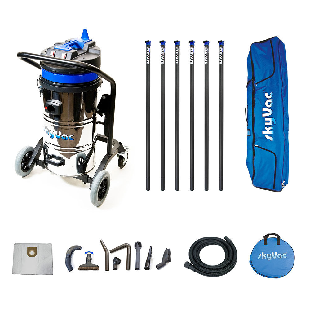Das skyVac Profi-Innenreinigungsset INTERNAL 78 besteht aus einem starken Zwei-Motoren-Sauger zur Nass- und Trockenanwendung und leichten Karbonstangen, mit welchen Sie hochgelegene Stellen bis 12 Meter Höhe im Innenbereich erreichen. Sie erhalten den Sauger im Profi-Set mit Saugstangen in 6, 9 oder 12 Metern Länge.