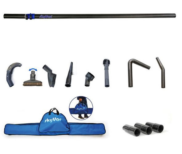 Die skyVac Teleskop-Saugstange, die abgewinkelten Werkzeughalter und die verschiedenen Bürsten lassen sich in der mitgelieferten Tragetasche leicht verstauen und transportieren.