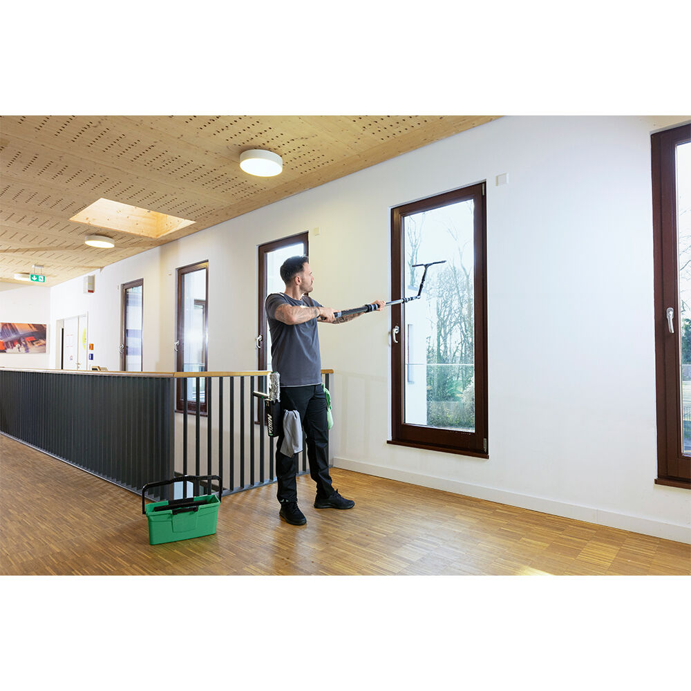 ECOSHINE Glas Innenreinigungssystem – perfekt für die Reinigung von Glasflächen im Innenbereich Mit einem Teleskopstiel können sie Höhen bis zu 4 m erreichen. Es ist robust, wendig und einfach zu bedienen. Kombiniert die Reinigungskraft von reinem Wasser und Mikrofaser. Ideal für enge Bereiche wo man nicht mit einem normalen Einwascher und Abzieher arbeiten kann.  Anwendung Sprühflasche mit Reinstwasser befüllen, Glas-Pad besprühen und Glas-Fläche reinigen. Einsatzbereiche Trennwände Spiegel und Duschen Treppengeländer Schaufenster Vitrinen Digitale Schilder Dieses Set beinhaltet 1 x Teleskop Stiel bis 2,74m 1 x 25 cm Pad Halter 2 x Glas Pad 2 x Mikrofasertücher 1 x 300 ml Sprühflasche 1 x Tragetasche