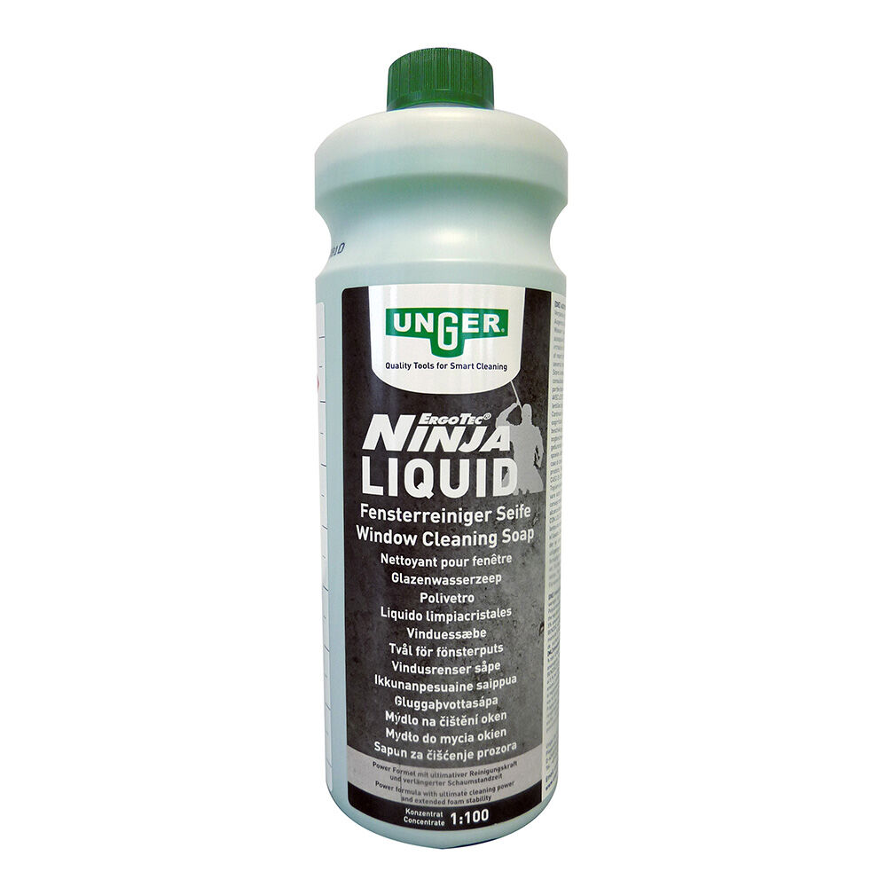 UNGER ErgoTec Ninja Liquid – Fensterreiniger Seife mit Power Formel Das UNGER Ninja Liquid war ursprünglich nur in limitierter Black Series Version erhältlich. Wegen des großen Erfolgs ist die Glasseife unter neuem Namen jetzt dauerhaft erhältlich. Das Ninja Liquid Glas-Reinigungskonzentrat von Unger hat die Power Formel, die für eine verlängerte Schaumstandzeit und ultimative Reinigungskraft sorgt. Dank bester Gleitfähigkeit, gleitet das Wischergummi bei Verwendung der Ninja Liquids schnell und gleichmäßig über die Glasfläche.  Warum ist eine lange Schaumstandzeit in der Glasreinigung von Bedeutung? Stabiler Schaum eines Reinigungsmittels hilft Ihnen dabei, effektiver und schneller zu arbeiten: Mit einer hohen Schaumstandzeit können Sie mehrere Fenster direkt hintereinander einwaschen, bevor Sie diese mit dem Fensterwischer abziehen. Vorteil: Sie müssen den Einwascher seltener in den Eimer tauchen, sodass Sie bei der Glasreinigung schneller und effizienter vorgehen können.  Anwendung des Unger Ninja Liquids Das Ninja Liquid ist sehr ergiebig. Geben Sie es im Verhältnis 1 zu 100 direkt in das Wischwasser. Für 10 Liter Wasser benötigen Sie folglich nur 100 ml Reinigungs-Konzentrat.  Vorteile professionelle Fensterreinigungs-Seife mit hoher Ergiebigkeit (Konzentrat 1:100) Power Formel mit ultimativer Reinigungskraft für streifenfreie Ergebnisse lange Schaumstandzeit hohe Gleitfähigkeit UNGER Ninja Liquid passt zu: ErgoTec Power Einwascher (JBC350-000) ErgoTec Ninja Einwascher (JNA350-000) StripWasher Pad Strip Pac (JRC350-000) StripWasher MicroStrip Pac (JNC350-000) StripWasher Monsoon Strip Pac (JMC350-000) StripWasher Original Strip Pac (JWC250-000) ErgoTec Ninja Fensterwischer 40° / 30° (JE3300-000) ErgoTec Fensterwischer Soft / Hard (JES250-000) S Fensterwischer Soft / Hard (JSE250-000) Pro Fensterwischer (JPR000-000) VisaVersa (JVP250-000) Eimer, 28 Liter (JQB220) Eimer, 18 Liter (JQB120) Produkteigenschaften Gebindegrößen:   1 Liter Flasche VE:  12 Pflichthinweise H319 Verursacht schwere Augenreizung P101 Ist ärztlicher Rat erforderlich, Verpackung oder Kennzeichnungsetikett bereithalten | P102 Darf nicht in die Hände von Kindern gelangen | P280 Schutzhandschuhe / Schutzkleidung / Augenschutz / Gesichtsschutz tragen | P305+P351+P338 BEI KONTAKT MIT DEN AUGEN: Einige Minuten lang behutsam mit Wasser spülen. Eventuell vorhandene Kontaktlinsen nach Möglichkeit entfernen. Weiter spülen Inhaltsstoffe nach Detergenzienverordnung 648/2004: 5% und darüber, jedoch weniger als 15 % nichtionische Tenside, unter 5% amphotere Tenside, anionische Tenside, Polycarboxylate, Duftstoffe Herstellervideo zur Unger ErgoTec Ninja Liquid Fensterreinigerseife