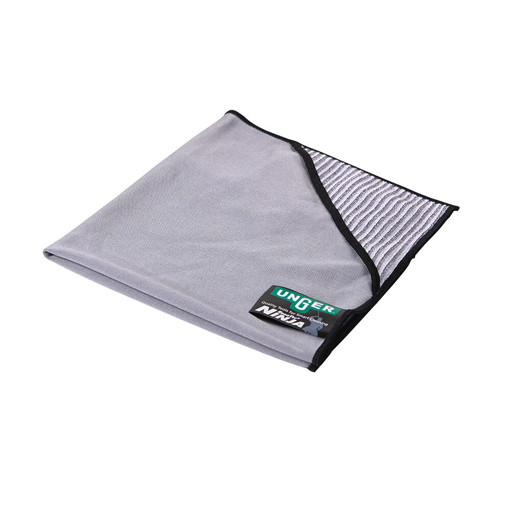 Unger Ninja MicroWipe – Premium-Mikrofasertuch für die professionelle Glasreinigung Das Unger ErgoTec Ninja Microfasertuch mit abrasiven Ecktaschen ist fusselfrei und nimmt eine hohe Menge Wasser auf. Gereinigtes Glas und Rahmen trocknen schnell und werden streifenfrei sauber. Die hohe Materialstärke des Tuchs sorgt für eine sehr gute Reinigungswirkung und eine längere Lebensdauer im Vergleich zu dünneren Tüchern. Ein stabiler Rand mit 5 mm Stärke bewirkt, dass dieses Profi-Microfasertuch auch bei intensiver Nutzung seine Form behält. Das ErgoTec Ninja Tuch verfügt über vier Schrubb-Ecken aus groben Schrubbfasern auf der Außenseite und einem weichen abrasiven Gewebe auf der Innenseite. Nutzen Sie die raue Seite für die schnelle Entfernung von hartnäckigem Schmutz auf Glas und Rahmen, die weichere Innenseite für kratz-empfindliche Stellen. Die Ecktaschen machen das Ninja-Tuch zum idealen Begleiter für die Glasreinigung mit der Teleskopstange. Sie erhalten das ErgoTec Ninja MicroWipe hier im Online-Shop in folgenden Größen: 40 x 40 cm, Art.Nr. JMN40H 55 x 55 cm, Art.Nr. JMN55H 80 x 60 cm, Art.Nr. JMN60H Vorteile für Unger ErgoTec Ninja MicroWipe sehr hohe Wasseraufnahme für längere Reinigungsintervalle dickes Material (400 g/m²) für erhöhte Lebensdauer und optimalen Reinigungseffekt extra-starke Kanteneinfassung abrasive Ecktaschen gegen starken Schmutz, auch gut für die Arbeit auf Teleskopstangen hält ca. 500 Waschzyklen Das ErgoTec Ninja MicroWipe ist kompatibel mit: Schürze (JSRZ10) ErgoTec Tüchertasche (JBSPOU) ErgoTec Ninja Fensterwischer 40° / 30° (JE3300-000) ErgoTec Fensterwischer Soft / Hard (JES250-000) S Fensterwischer Soft / Hard (JSE250-000) Pro Fensterwischer (JPR000-000) VisaVersa (JVP250-000) ErgoTec Ninja Einwascher (JNA350-000) StripWasher Microstrip Pac (JNC350-000) StripWasher Monsoon Pac (JMC350-000) StripWasher Original Strip Pac (JWC250-000) StripWasher Pad Strip Pac (JRC350-000) RubOut (JRUB20) Produkteigenschaften Material:  70 % Polyester, 30 % Polyamid Materialstärke: 400 g/m² Größe: 40 x 40 cm; 55 x 55 cm; 60 x 80 cm Farbe: grau Im Herstellervideo gibt es weitere Informationen zu den UNGER ErgoTec Ninja Microwipe