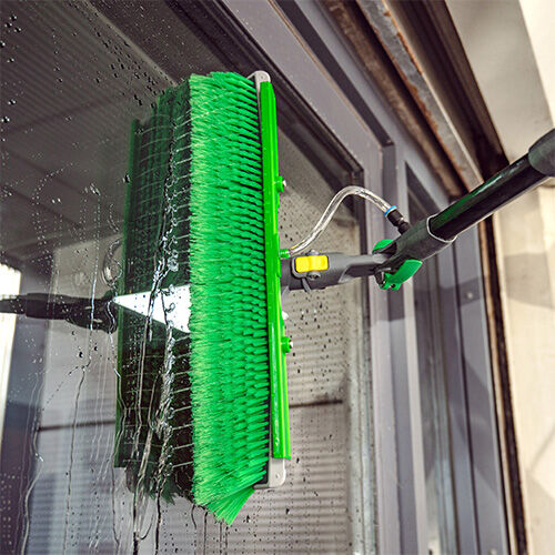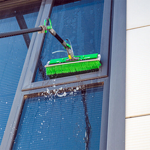 Die nLITE Winkelbürste mit flexibler Spülleiste, integriertem Düsenblock und Schnellanschluss, hat einen abgeschrägten Borstenschnitt mit dem Sie Ecken und 90° Winkel schnell und sorgfältig reinigen. Die besonders dichten Borsten garantieren die hervorragende Reinigung mit wenig Biegung und eine lange Haltbarkeit. Auch für heißes Reinwasser geeignet! Der umlaufender Stoß- und Kantenschutz aus weichem Kunststoff schützt Fensterrahmen vor Kratzern und anderen Beschädigungen. Zudem reduziert der Schutz die Geräusche beim Kontakt mit Gebäudeteilen.