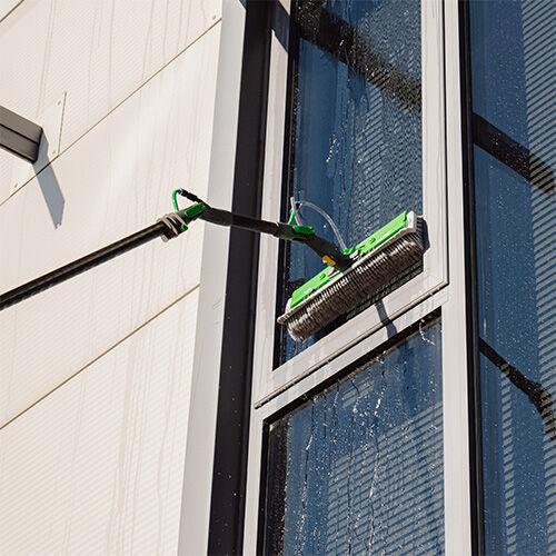 Die Möglichkeit der Wasserzufuhr über drei Wege bietet Flexibilität und führt dazu, dass sich Verschmutzungen äußerst leicht entfernen lassen. Der Wasserstrahl aus dem mittig in der Winkelbürste integrierten Düsenblock ermöglicht eine kraftvolle Reinigung, während die Spülleiste, bzw. Rinse Bar das Spülen des Fenster in einem Schritt während der Reinigung erledigt. Die Rinse Bar lässt sich zudem in zwei verschiedenen Positionen verwenden, damit die Winkelbürste auch um 180 Grad gedreht verwendet werden kann: so lassen sich sowohl Fensterbänke als auch Rollladenkästen optimal reinigen.